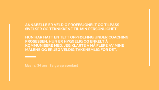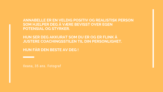 Annabelle, nysgjerrig og bestemt kvinne. Jeg har alltid hatt mennesker i fokus, som entusiastisk kollega, leder og nå, som coach. Jeg er stolt grunnlegger av Impuls Coaching siden 2020, spesialisert i Karriereveiledning, liv coaching og personlig utvikling. Jeg har samlet spennende menneskelig opplevelser, akademiske utfordringer og kommunikasjon erfaringer innen Salg, HR, avdelingsadministrasjon og ledelse. Jeg har alltid vært inspirert av de andre rundt meg og få glede nå av å kunne støtte aktivt personer til å nå sine personlige og profesjonelle ambisjoner.